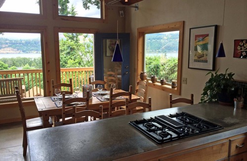 Beautiful Rustic / Modern home just west of the downtown business district of Hood River with unobstructed views of Mt. Adams and the Columbia River. Due to strict regulations, the majority of vacation rentals in Hood are located within the busy business districts - this home is one of few available in a relatively calm, centrally located, residential neighborhood.
