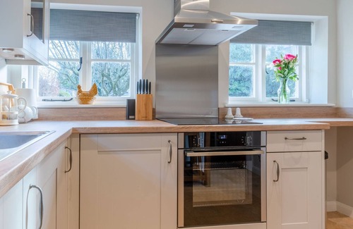 This contemporary, dual aspect kitchen has been very cleverly designed to include all the equipment and appliances needed for a self-catering stay. In addition, there is a bar table with two high stools and a recessed worktop with USB charger sockets where guests can sit and use a laptop while on a workation or planning a day's outing.