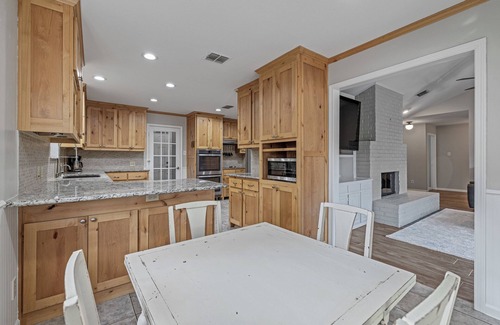 Nestled in the heart of Flower Mound, this beautifully furnished home is the perfect retreat. Close proximity to major highways, medical centers, and vibrant shopping centers like The Shops at Highland Village. Fully Equipped Kitchen with Stainless steel appliances, granite countertops, and all the essentials. Cozy bedrooms with premium bedding for restful nights. Stay connected with fast Wi-Fi. Private backyard with seating area and fire pit.