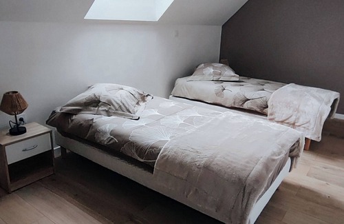 Le gîte est composé d'une cuisine équipée, d'un salon chaleureux avec poêle à pellets pour des soirées douillettes, et de deux chambres : une avec un lit double et une autre avec deux lits simples.