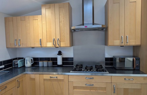 The space opens up into a large modern kitchen-diner equipped with loads of cupboard space, with a full size fridge freezer, a modern gas cooker hob, built-in double grill and oven, microwave, kettle and toaster. Crockery, cooking utensils and cutlery are all provided. Tea, coffee, sugar and cooking essentials are also offered.
