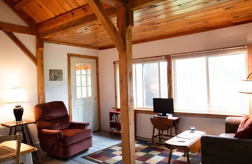 The cottage has wood beamed ceilings and pine floors. There is a screened porch from which you can enjoy sunset views and the wildlife over the water.