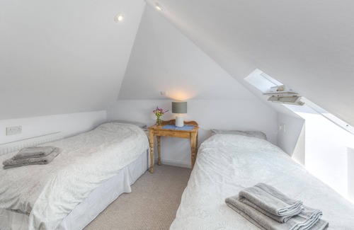 The front door of the cottage opens into a large open plan area with kitchen, living and dining area. The kitchen has a breakfast bar and an oven, microwave, fridge and freezer and is fully equipped with everything that you need to make proper family meals. The dining table seats up to 6 guests and the living room has soft seating for 4. There is a bathroom (with bath and shower) and utility cupboard with washing machine on the ground floor. Upstairs are 2 pretty bedrooms under the eaves: one with a double bed and one with 2 singles with hanging space in both.