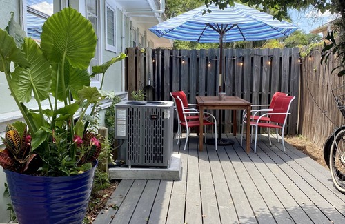 Norris Cottage Unit A is set on a picturesque street in the heart of the quaint village of St. Mary's, Georgia. The property is a duplex and Unit A is at the front of the property. Although the unit is small, its space is used quite efficiently. Guests can expect two lovely bedrooms, a cozy living area, a kitchen and bathroom. There is a small patio for outdoor dining and two adult bikes are provided for easy exploring. Pups are always welcome for a small additional fee.