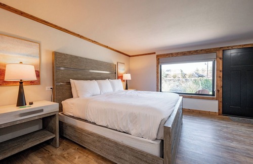Comfort and convenience from every angle, this poolside suite retreat provides you access to everything in just a few short steps. Spread out in the plush King bed and rest up for your next lake adventure. This suite also has a Queen sleeper sofa for additional sleeping space. Equipped with a full kitchen to cook meals, Smart TV, and a luxurious bathroom with walk-in shower and quality bath products. Walk right out to your private patio for two and take in the fresh mountain air before heading down to the pool or any of our amenities. This suite is accessed from the interior of the first floor for your convenience.