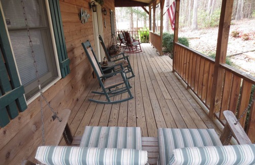 Wooden decks wrap around most of the home, providing beautiful views of the lake and the surrounding forest. There is also a screened in section of the back deck with a table and chairs for outdoor dining. The huge front porch has rocking chairs and a porch swing and is the perfect spot to relax and read a good book or just enjoy the atmosphere.