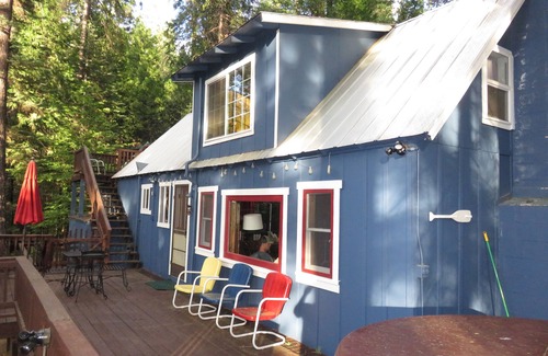 Come stay at our sweet little cabin in the woods amongst towering redwood and cedar trees. Its a short 5 minute walk to Fly-In Lake and privileges at Blue Lake Springs Recreation Center during the summer months. One bedroom downstairs with a queen bed and a trundle bed and two bedrooms upstairs using the secret pull down stairs. Upstairs has a princess bedroom great for the kids with two twin beds, and a surf room with two double beds. 15 minute drive to Murphy's for wine tasting and 40 minute drive to Bear Valley for skiing. Ample wrap around deck space for outdoor fun with hot tub and BBQ. Its small but cozy equipped for kids and adults alike. This 1949 built cabin has updated bathrooms, and appliances, and modern amenities such as DirecTV and WiFi. The large fireplace warms up the living room and provides great ambiance. We are pet friendly for a 100.00 fee. Or 50.00 per night per pet.
