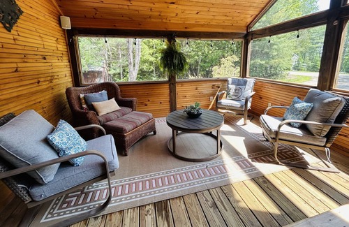 The Chalet includes two bedrooms downstairs, each with queen beds. Upstairs is a loft with four twin beds. One bathroom downstairs, full kitchen, living space with t.v. & Roku tv included w/ dvd player. Satellite Wifi is also available. There is a three season screened porch with a new 6 person hot tub, 8ft picnic table, and comfortable seating area. We have a selection of DVD’s, board games, and playing cards. Outside is a fire pit, bring firewood. Outdoor gas grill w/ propane provided. This Cabin is in a RURAL area. It’s a place to escape and unwind. In the event of a storm; you could experience a power outage. Please note: The rate is based on a 4 person occupancy. Additional guests: $35 per night/per person. Pet fee $30 per pet. Quiet hours are to be observed between 9:30pm-8am. Thank you!