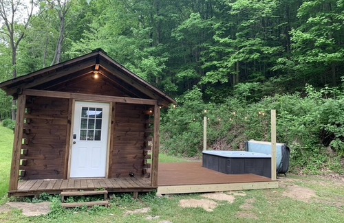 Enjoy the best of both worlds! Our lovingly restored cabin is 15 miles from all of Hocking Hills' beautiful attractions on 2 creekside acres, with spacious porches, yard, fire pit, & hot tub and deck! Just at the outskirts of Laurelville-- half a mile from gas, groceries, diners, parks, & Laurelville Fruit Co. Enjoy the cozy living space with gas fireplace, 55 inch smart TV, puzzles, games, & books. Full kitchen and 4 person dining table for making meals & memories together.