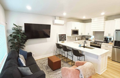 This spacious rental features two bedrooms and one full bath upstairs, plus a half bath and sleeper sofa downstairs. Premium bedding, a 65” smart TV, a fully equipped kitchen, and in-unit washer and dryer make your stay comfortable and hassle-free.