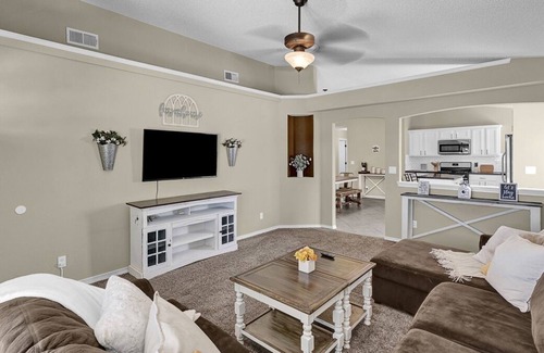 Discover our charming farmhouse-style retreat in Far East El Paso, ideal for families of up to six. A spacious living room with a large couch sets the stage for family gatherings, while the generously sized dining area comfortably seats eight.