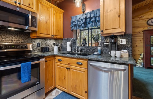 Inside, you’ll find three cozy bedrooms, two full bathrooms, a comfortable living room with a sectional and Smart TV, plus a separate game room stocked with board games to delight. Kids love the tree fort and the cabin playhouse, while the covered deck and propane grill make outdoor dining easy for grown-ups to chill. The single-car garage is also available for guest use plus houses a full-size washer and dryer for your extended stay.