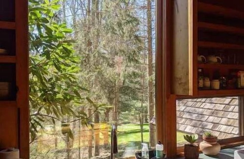 Unwind in this beautiful and cozy home nestled in the Catskills. Equipped with a double sided wood fireplace/pellet stove, loaded kitchen, new mid-century furnishings, and outdoor views, this architectural cabin is the perfect place to escape.
