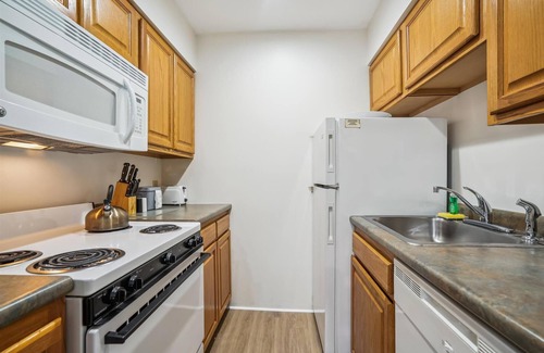 Full Kitchen with Electric stove, Microwave, Dishwasher, toaster, and Keurig