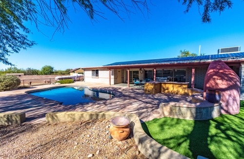 Discover your Desert Hideaway in the heart of a NW Tucson. Start your mornings embraced by stunning mountain vistas. Our spacious retreat comfortably accommodates your entire family and more. With a sprawling yard, saltwater pool, and expansive outdoor entertainment area, you'll be tempted to stay outside all day. Whether you prefer indoor or outdoor bliss, we've crafted both spaces for your utmost enjoyment. Indulge in your preferred fancy at our enchanting abode.