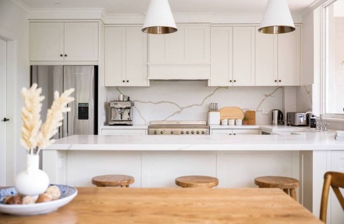 This luxury coastal sanctuary exudes serenity in an unbeatable location, ideal for a beachside or golf getaway, wedding, or even writing a book. Unwind in the air-conditioned living room in the comfort of soft couches or be engulfed by the cosy reading armchair. Entertaining is easy with a large HD TV and an adjoining undercover balcony with a picnic-style eight-seater table. Light streams in the wall-to-wall glass upon the living and dining area, where meals at the chic timber table are bathed in fresh air and warmth. The kitchen island doubles as a breakfast bar setting under featured pendant lights. Cooking at home is a pleasure with generous space stretching across the marble-style benchtops, detailed profile cabinetry, french door fridge, large oven and induction stove.