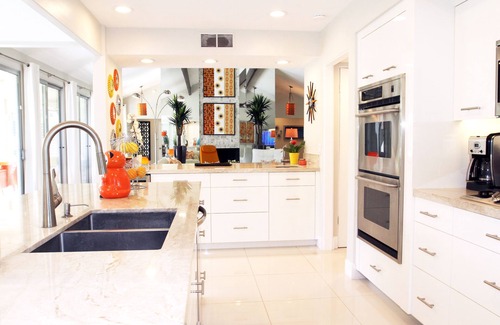 Stay in this stylish, contemporary home with a mid-century/Hollywood Regency design theme. This home includes a great room with 20' ceilings, designer furnishings, gas fireplace, outdoor fire pit, complimentary Wi-Fi, 3 flatscreen TV's all with DVD's, and 12 - eight foot sliding glass doors throughout the home.
