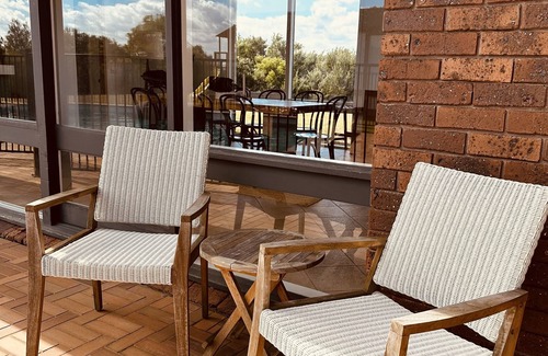 Lounge Room- Views over courtyard and country side. Includes- 65inch LED TV, Netflix, DVD Player, Large Comfortable couch with chaise, Luxury Bean Bags, Wood Fire Place, AirCon