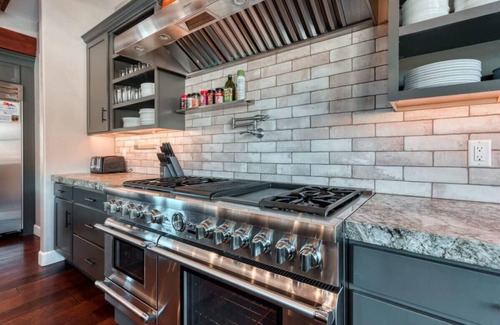 Kitchen - The luxury gourmet kitchen is fully stocked with everything you need to make meals at home. The space also includes a large island with seating for 4, stainless steel appliances, double oven, dishwasher, convenient pot filler, ice maker, coffee pot with complimentary coffee, blender, toaster, crock pot, baking dish, cookie sheets, roasting pan, hand mixer, and a large dining table with seating for 8.