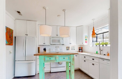 This classic 1962 beach cottage shouts fun! Find a lush enclosed backyard that is the perfect spot for family gatherings! This spot boasts an in-ground heated pool with a small waterfall, beach loungers, Adirondack chairs, a picnic table, and a gas grill. Inside, every corner of this quaint retreat boasts bright colors and beach juxtapositions of objets d'art. The front porch is great for making family memories and watching the activity of Carolina Ave as folks stroll to the beach! Gather in the living area to plan your next adventures or play board games with your loved ones. The kitchen is well-appointed with all major appliances needed to prepare the most delicious beach snacks and full-course meals for the gang. Right off of the kitchen is the dining table.