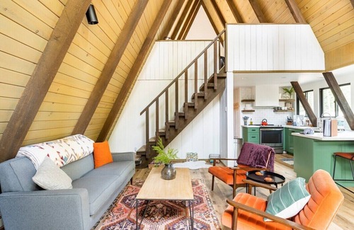Welcome to Dogwood Peak, a darling, remodeled a-frame cabin with mid-century vibes. At 960 square feet, the space strikes the balance of a cozy, cabin in the woods with comfortable modern accommodations so guests can find what they're looking for.