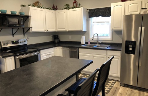 The property is one side of a duplex, newly renovated 2 bedroom 2 bath. Walking distance to the downtown restaurants and bars. Fully stocked kitchen with bar seating. ROKU TVs in the master bedroom and family room.