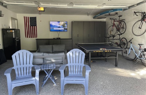 In addition, you will have access to our two stall garage game room with ping pong, corn hole, Xbox, frisbees and fishing poles as well as a generous amount of seating and two outdoor driveway spots.