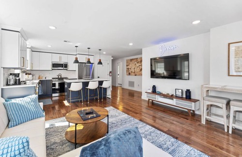 The Dream Unit is an amazing New Construction House that features two levels of luxurious amenities. The main level features Living and dining combo with 3 spacious Bedrooms, 2 full bathrooms, Queen sized sofa bed. The lower level is purposely designed to entertain with an 85” smart TV w/ surround sound bar and full living room set up with a Fill size leather couch, loveseat and matching oversized chair. The lower level also features a Foosball table, Air hockey table, and Classic arcade game featuring titles such as Ms. Pacman and Galaga. There are also classic board games for group play and a complimentary snack bar featuring beverage center, a full size popcorn maker and plenty of other potato chips and cookies. A full size laundry room with a Samsung washer and dryer complements the lower level plus a powder room for the guest. There is also a full size fitness gym on the lower level featuring a “Smith Machine” workout station with pulleys for additional exercises and Big Box Gym quality Treadmill and Stationary Bike with Dumbbells, Bosu ball and yoga mat. Adjacent to the gym is an oversized 1 car garage with metallic epoxy flooring. The lower level also leads to our outdoor living space in the backyard. We have a Blackstone grilling station next to our extra large Floating deck with covered gazebo and with a fold down 65 inch TV for your viewing enjoyment. Last but not least, we have a “HOT TUB” section that has enough seating to accommodate 4 guests for a truly spa like experience. No Smoking inside the unit, only at designated area in Back yard by smoking post.