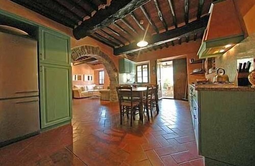 The house is warmly furnished with a mix of traditional Tuscan antiques and overstuffed couches and chairs that complement the stone and richly colored stucco walls. The kitchen is fully equipped with range, refrigerator/freezer, dishwasher, and pots and pans that even the most discriminating cooks will enjoy using.