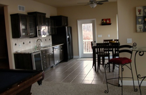 When you feel like staying in, there is plenty to do with a regulation size pool table, lower-level bar/kitchen with pub table to seat 8, board games, foosball table, stereo, projection TV on the lower level, Blu Ray, and a flat panel TV in the upper living room. All kitchens and adult baths have granite stone tops and beautiful cabinetry. Cook as much as you like in the fully equipped kitchen that seats 8 plus dining room for 8 more on main level or go enjoy one of the many nearby restaurants on the water right from the dock, with your boat. A few other conveniences include 2 car garage, washer/dryer, additional full-size refrigerators on the lower level and dock, and a regular and over-sized gas grill. We also have a great fire pit area near the lowest level deck to enjoy family campfires with a great view of lake. There are outside speakers and stereo equipment with an iPod connector on the dock. Wi-Fi access, Netflix and YouTubeTV is an added perk.