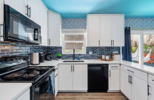 Welcome to Palm to Palm, an eccentric 2BR+2BA home ideal for friends and families seeking a fun, amenity-packed vacation. Recently renovated in 2022, the interiors have been redesigned to capture a vibrant Florida vibe. The highlight of the home is our outdoor entertainment area, featuring a solar heated pool and a tiki hut with hanging swings. Additionally, there is an outdoor kitchen equipped with a grill and mini-fridge.