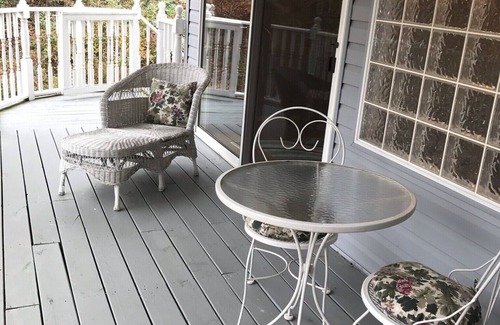 Two rockers, a table, a glider, a bistro table and 2 chairs, and a lounge on our 50 foot long front porch offer a relaxing place where the sound of the nearby creek lulls our guests--a favorite place for many! Adults and children alike delight in lightning bugs on the yard beyond. Maintaining the colorful gardens on the property are my joy! A bench at the pond and dock where we feed our koi add delight to your experience.
