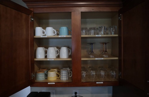 The kitchen, opposite the master bedroom, is spacious and fully stocked, including four bar stools for casual dining or conversation, a double oven, gas stove, dishwasher, and a coffee station. It also includes a blender, smoothie maker, microwave, slow cookers, and BBQ tools.