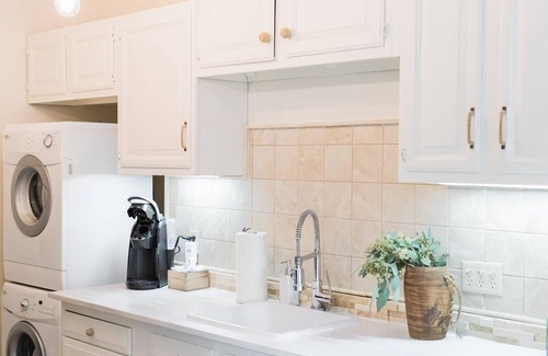 Three stories, all interconnected by a stunning open staircase, with the convenience of two washers/dryers and two large kitchens. This space is in the heart of it all and provides an "insider" feel to visiting. If you open the front doors leading into each apartment you can experience the feeling of being in one large home.