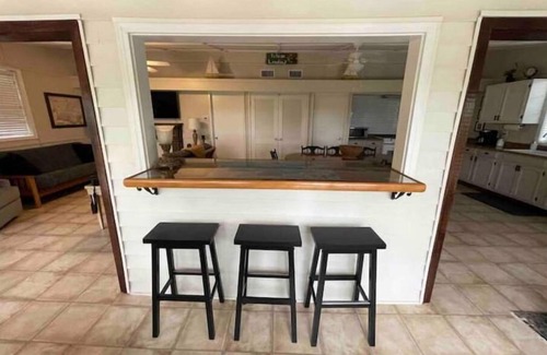 The cabin offers 2 bedrooms and 2 full baths. The "Master Bedroom" has a Queen size bed and the "Spare Bedroom" has two full size beds. Both bedrooms offer smart TVs, ceiling fans, luggage racks, ample closet space, black-out curtains, dressers and lamps equipped with AC outlets and USB C+A ports. The upstairs bathroom has a tub/shower combo and the downstairs bathroom has a stand up shower. The kitchen is stocked with a complete set of pots & pans, knives, bakeware, blender, toaster and more. The dining table seats 8 and the bar overlooking the bayou seats 6, all together in an open living space with 2 futon sofas that offer additional sleeping space for 4. Enjoy watching the squirrels and birds in the trees from a relaxing sitting area on the sun porch, overlooking the bayou.