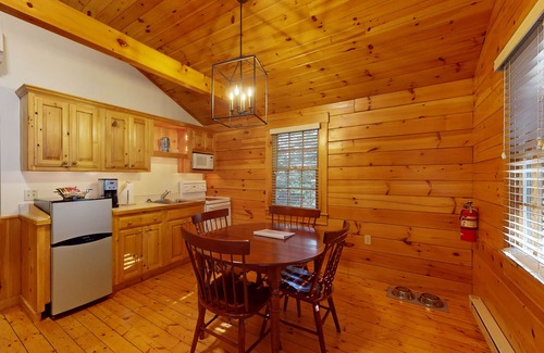 Step outside to enjoy the firepit, perfect for roasting marshmallows under the stars after a day of adventure. This cabin has a "tucked" in the woods feeling although other cabins are not far away. There is a small pond on site and this cabin is an easy walk to check that out as well. With air conditioning and streaming capabilities, you can unwind indoors or enjoy your favorite shows after a long day of exploration. This dog-friendly cabin ensures that your furry friends can join in on the fun.