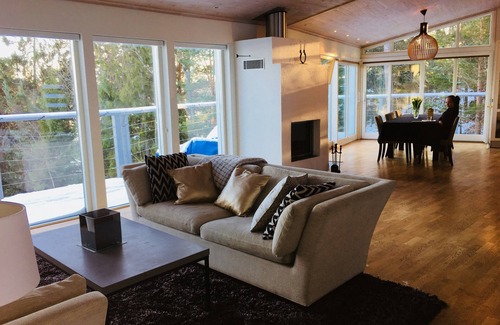 Modern family home overlooking the ocean. Relax i in the outdoor jacuzzi or indoor sauna and watch the ferries cruise by. Open plan kitchen and living area, large patio space, grill, high-speed WiFi, 5 minute walk to ocean swimming beach or cliff area. Door opens to patio from almost every room.