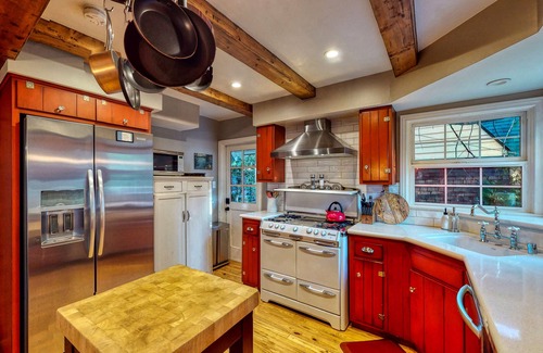 The bright kitchen is open to the living room and features a gorgeous vintage range, Corian countertops, and everything you need to enjoy a meal with the family. There is also dual access to the deck, from both the living room and the kitchen. Sit outside and enjoy the trees, the mountain air, and the starry sky. Turn on the string lights and enjoy the evening! Wi-Fi is available throughout the home, and air conditioning is available for those hot summer days.