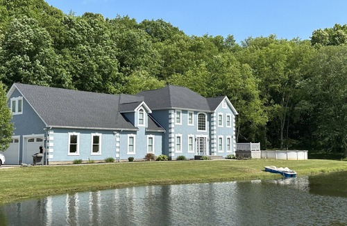 The perfect home with 4.1 acres of property with a half-acre pond and a pool to spread out and have fun with family and friends. Swim in the pool, fish, kayak, or canoe on the pond, make s'mores over the campfire, relax and chat under the cabana, and listen to the wildlife in the evenings. This home offers families and friends plenty of space to spread out but also enjoy each other's company while getting away from the hustle and bustle of life. The game room offers a shuffleboard table, poker table, and 60-inch flat screen tv. You'll enjoy this home's kitchen griddle & grill and the outdoor grill while cooking up meals for the whole family. There is plenty of space to play yard games and for kids to run and explore. With 6 bedrooms and a media room the sleeping quarters a offer a good night's rest.
