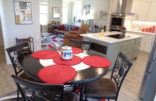 Newer house with modern style separate "mother-in-law" type apartment having private entrances. Set on 2.5 acres. Fenced lot. 1 car attached garage for guests. Open concept kitchen/living room area. 2 bedrooms and 2 full baths. Entire unit is approximately 1,500 sq. feet. Primary bedroom's bath has walk in jetted tub with separate shower, queen bed, Dish satellite system feeds 60" screen TV in the primary bedroom, living room has 65" curved OLED TV and a 32" flat screen TV in guest bedroom. Full guest room bath. Twin top and full bottom bunk bed with additional pull out twin trundle bed. Living room sofa/futon can be used as a twin bed. Kitchen has a double oven, dishwasher, large double door refrigerator, separate pull out cooling drawer, pull out freezer drawer and ice maker/ cold water dispenser. Large screened in attached porch opens to a gated fenced in-ground swimming pool that is constant kid-friendly 54 inches deep. Pool open late spring to early fall, weather permitting. Poll has a passive solar water heater. Only 5 minutes to Farmington with Starbucks, McDonalds, Wendy's Dairy Queen, Walmart Neighborhood Market and many other restaurants and amenities. Fayetteville and the University of Arkansas is only 10 minutes away. Crystal Bridges art museum, Walmart world headquarters, Amuseum children's museum within 15 miles. Numerous historical and tourist sites nearby. Excellent restaurants and eateries very close as well as in the area.