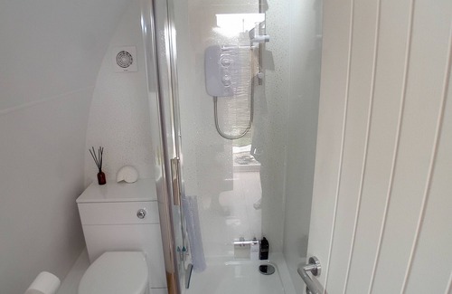 The bathroom comprises sink, toilet and shower stall, with a heated towel rail