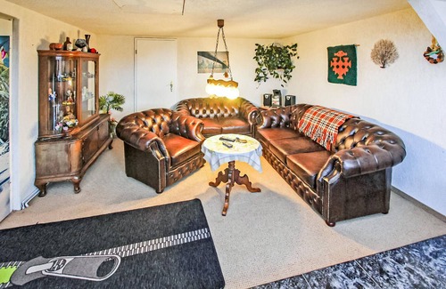 Access to the apartment is through a shared entrance area via a steep staircase. There is a living room with adjoining conservatory (upholstered furniture, flat-screen TV, radio/CD, dining table), 2 bedrooms (each with double bed, TV, 1 guest bed for a child to add), a kitchen (dining area, kitchen block with electric hob, fridge with freezer, various kitchen appliances) and a bathroom with shower/WC. There is a furnished balcony and storage space for bicycles. A high chair can be provided for small children.