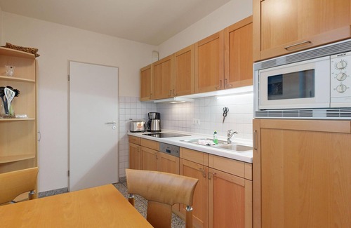 Equipment of the apartment on the mezzanine floor (B 1) (2 rooms / 55 m²): * Living room: 2 couches (one sleeping possibility each), cable TV, radio, DVD player, * This apartment has a free Wi-Fi connection. * Separate Kitchen with modern kitchen, with electric stove, dishwasher, microwave, dining area * 1 bedroom with a double bed * 1 bathroom with shower, toilet and hairdryer * Balcony Outside: * 1 parking space in the underground car park (entrance height 2.00 m) * Fahrradkeller Other: * In the season (summer) Minimum rental 7 nights, preferably not Saturday for arrival and departure * Minimum rental New Year's Eve 5 nights and Easter 3 nights * Non smoking apartment * Elevator * Swimming pool in the house * Sauna (fee) in the house * laundromat and - Dryer in the house * Pets are not allowed * Cot and highchair on reservation, only a limited number available Additional costs when booking or on site: * Use coin-operated washing machine and dryer * Use of sauna * Tourist tax