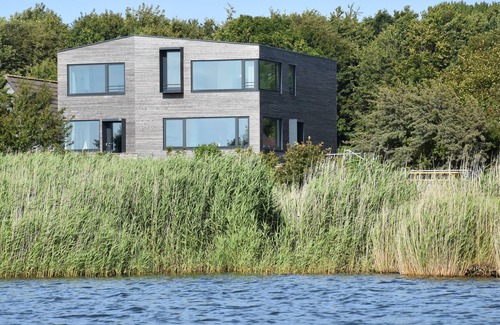 The Fjordhaus on the Schlei is a wooden structure completed by the architect Jochen Ziegler in autumn 2016 with a panoramic water view of the Baltic Sea fjord. The fjord house is located between Kappeln, the town of Arnis (3 and 4 km) and 8 km from the sandy Baltic Sea beach. It is located in a quiet area, only separated from the loop by a dead end.