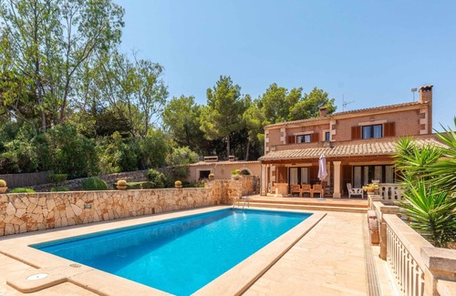Lovely Holiday House with large pool in Felanitx for a maximum of 10 people with mountain views, it has 5 bedrooms, 2 bathrooms (1 with shower, 1 with shower and bathtub) and 1 Guest WC, AC (hot / cold), satellite TV, free wifi, fireplace, furnished pool terrace with barbecue, private garage on the plot, well-kept garden with a bench to relax in the afternoon.