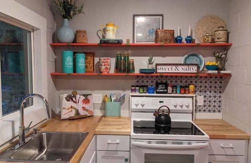 This unique place has a style all its own. This two bedroom one bath is perched on top of a hill with about 20 steps going up as seen in photos. The queen bedroom is complete with a desk and chair for the perfect work space. The king bedroom is spacious with a closet for extra storage. The kitchen is complete with all the appliances and dishes to make your stay extra enjoyable. This house is funky and fun and ready to host you!