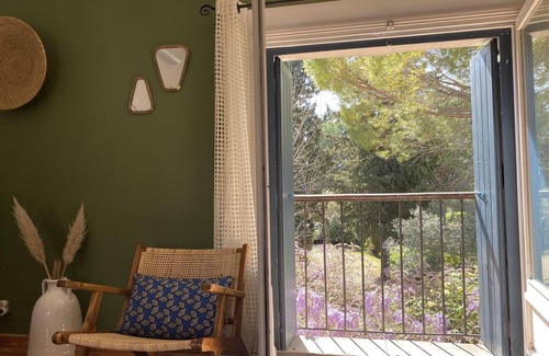 Located on the 1st floor of Mas la Pauline, access by an independent staircase, apartment of 37 m2 crossing, beautiful view of the quiet garden, south-facing balcony, very bright. Discover a unique, ethnic decoration made from travel souvenirs.