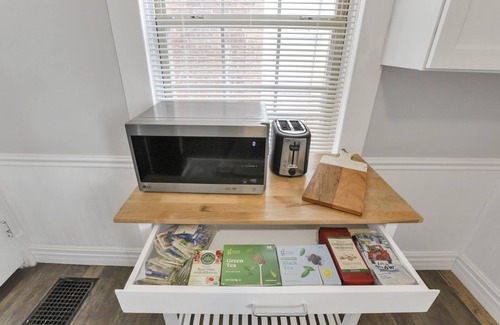 - Craft meals in our airy kitchen, fully stocked with cookware, French press, coffee maker, an assortment of teas, and a Brita water filter.