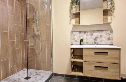 Single-storey gîte adjoining the owners' house. Entrance to the equipped kitchen (oven, Senseo coffee maker, microwave, French press coffee maker, 4-burner induction hob, 126L table-top refrigerator with freezer, dining area with high table and stools.