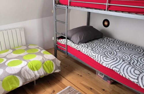 On the ground floor, a large fully equipped kitchen with wood stove. Large bright veranda. 1 bedroom with 1 double bed and 1 cot. 1 disabled-accessible shower room with WC (booster chair available).